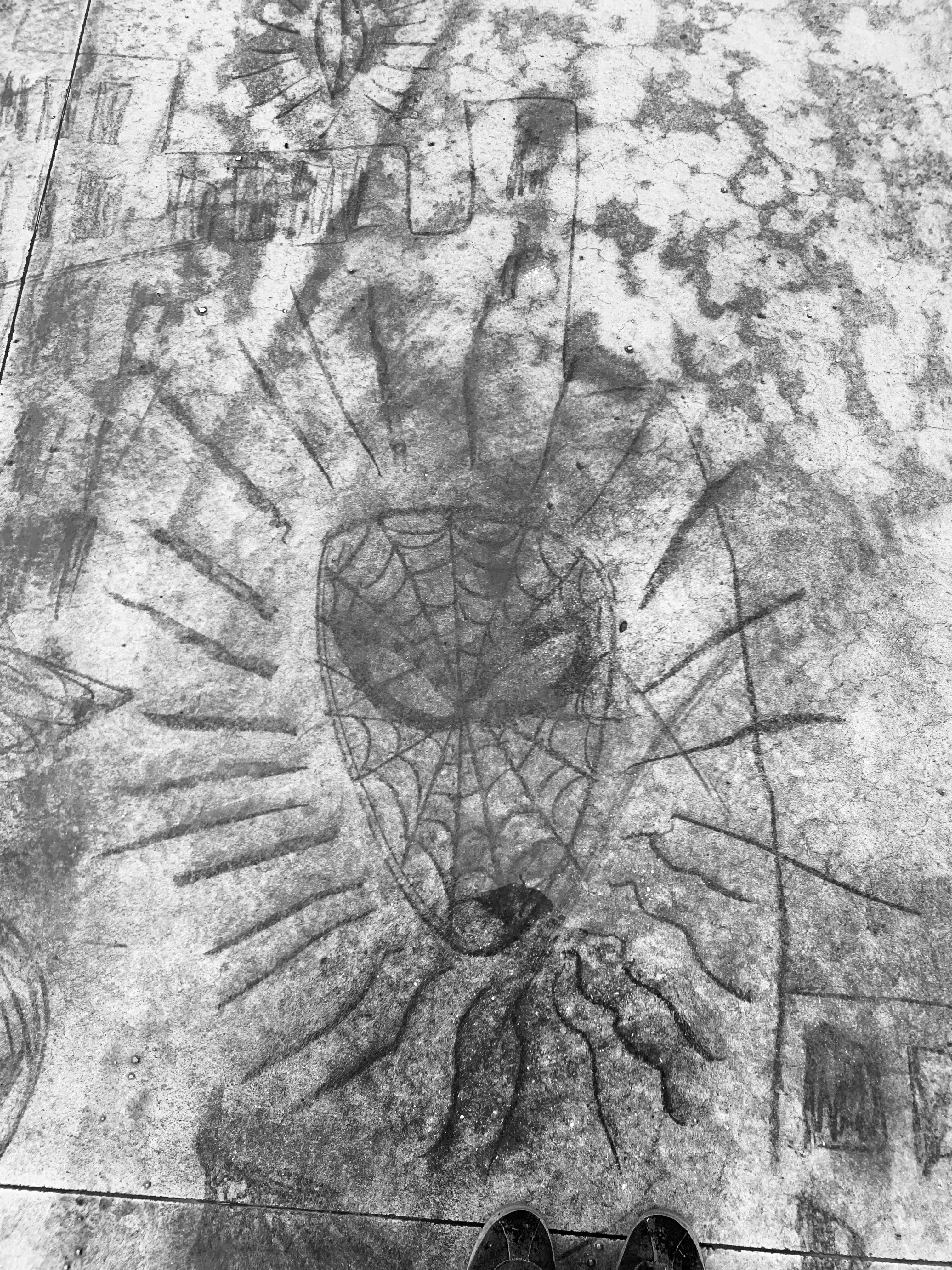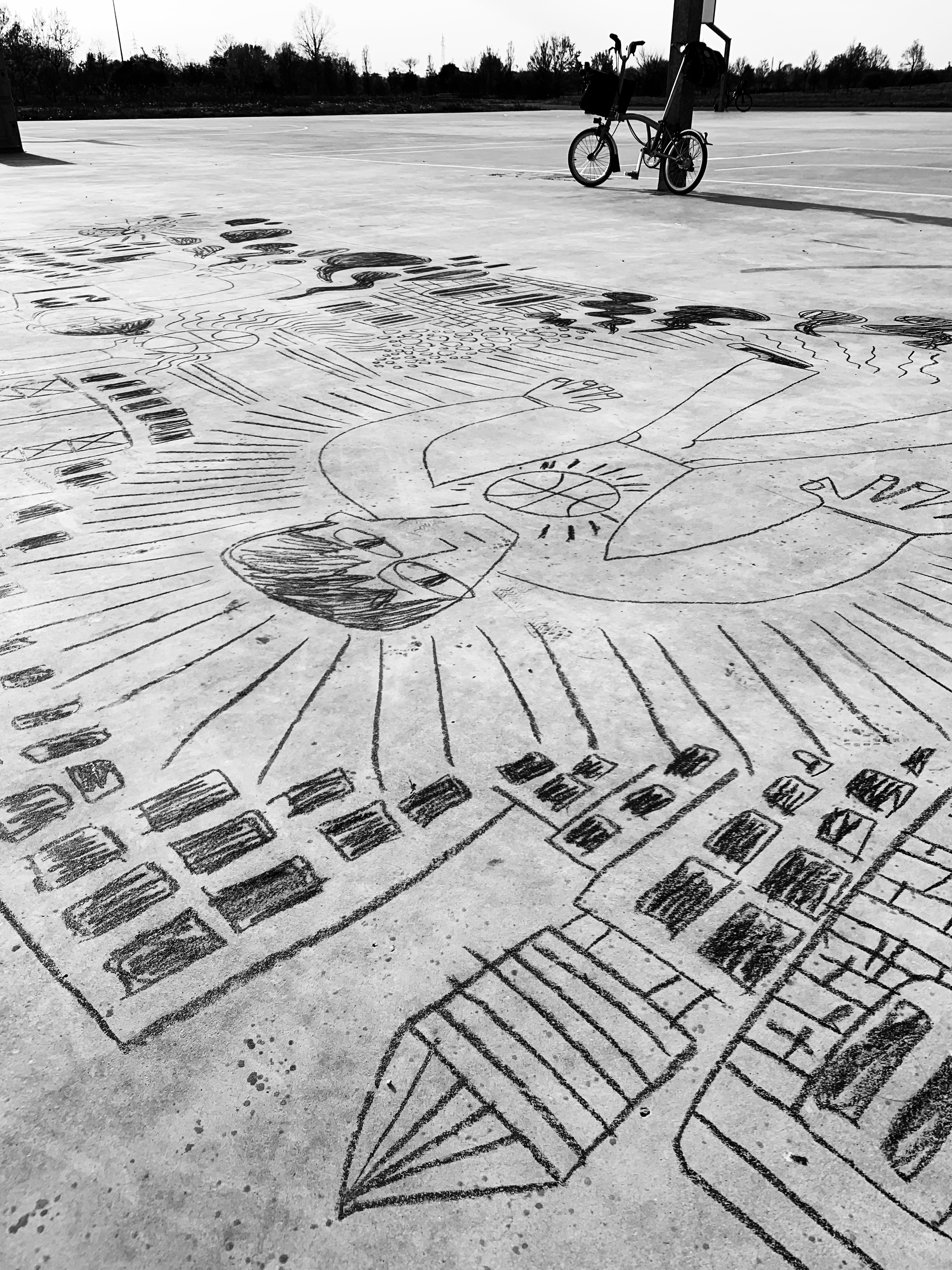 Disegnare con una barra di graffite acquerellabile su un campo da Basket e aspettare la pioggia per vedere come il segno si confonde con il cemento.