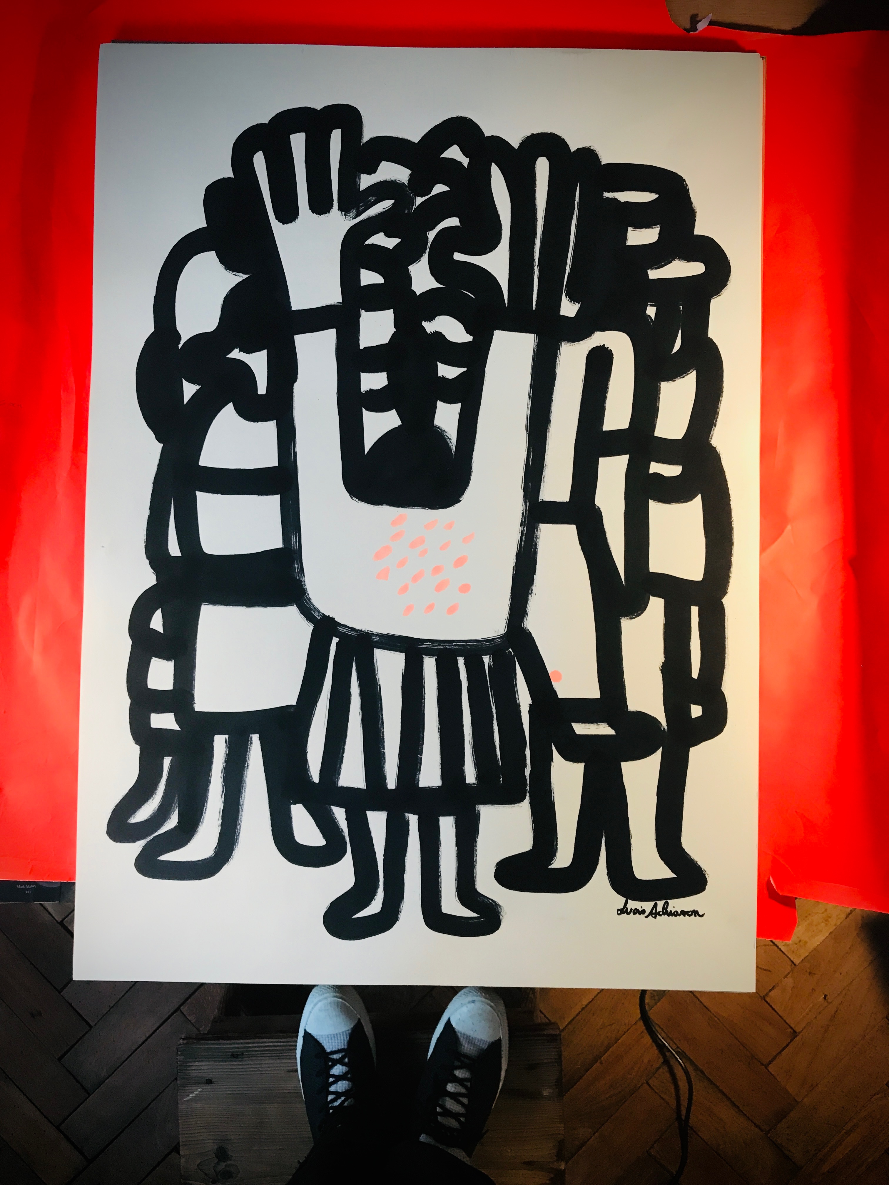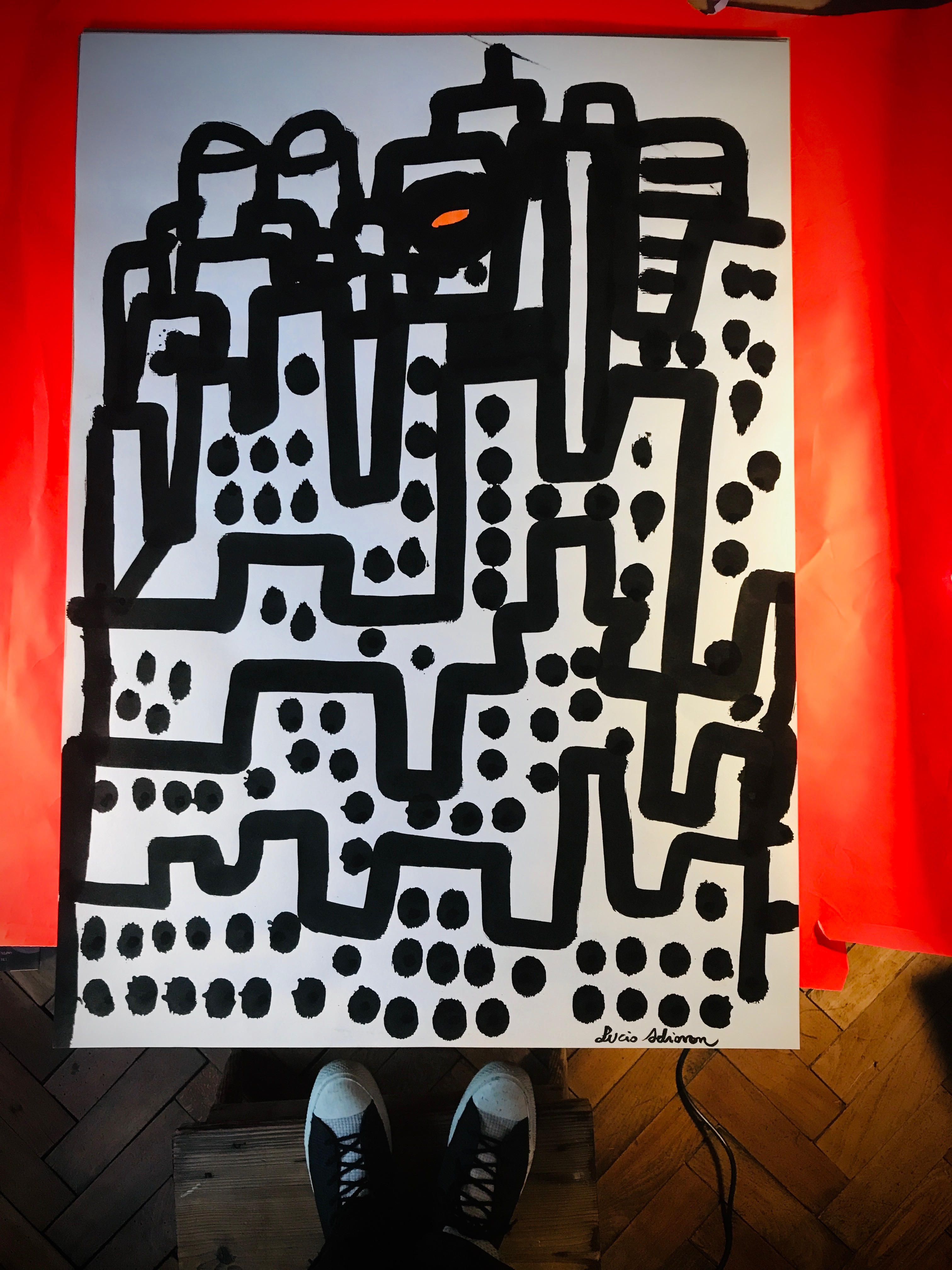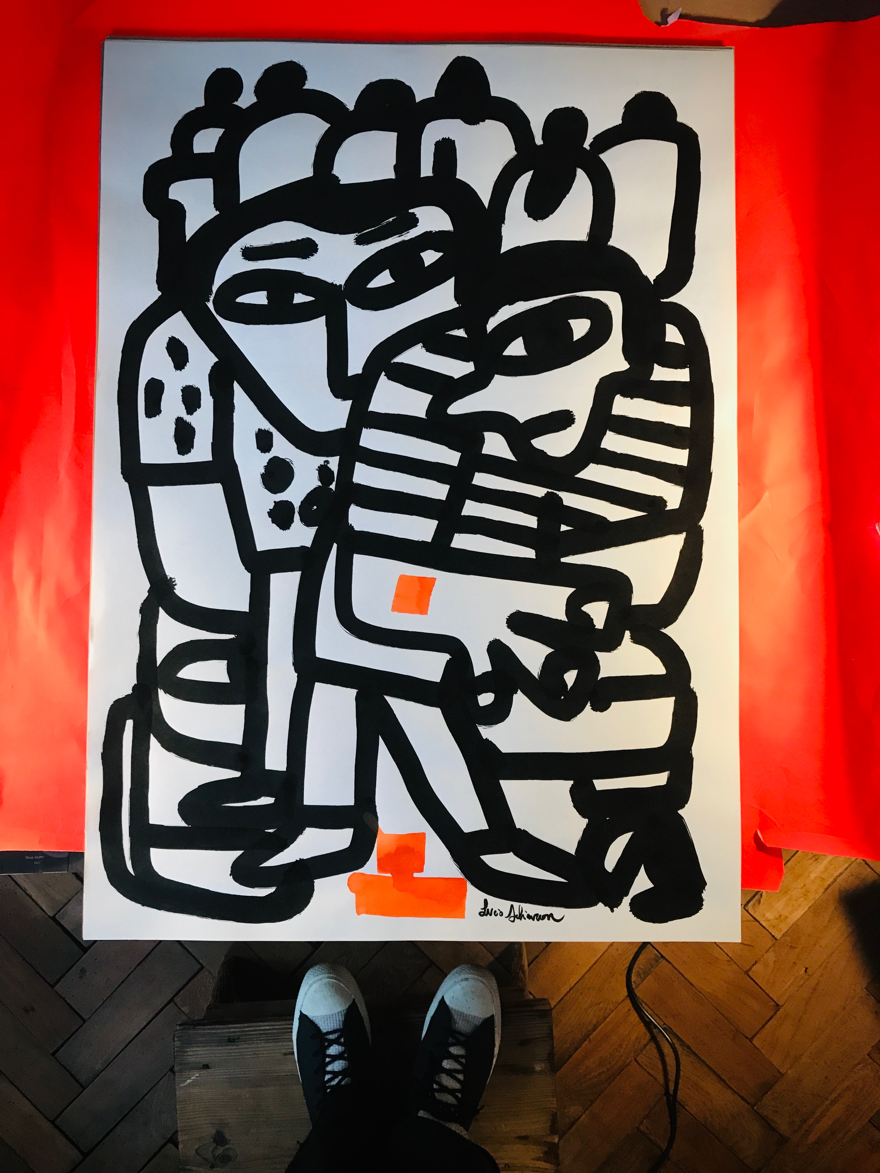 Foglio Bianco 35 x 50 pennarello nero e dettagli arancioni.
